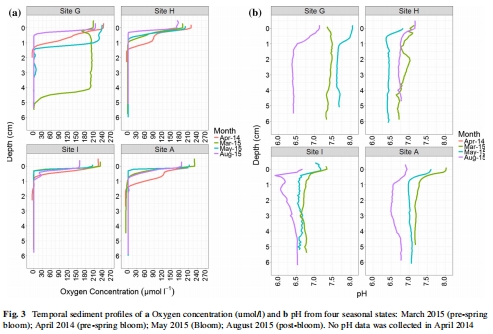 數據來源:Fig. 3(a和b子圖)展示了不同季節的氧氣和pH剖面變化。