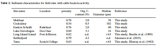 研究意義:這些數據用于分析電纜細菌分布的環境控制因素。例如,Table 1顯示電纜細菌在有機質豐富的細粒沉積物中更常見,有助于定義其生態位。