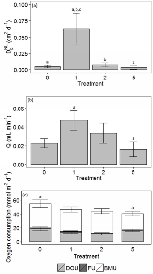 測量指標:總SCOC,及其三個組分:擴散氧吸收(DOU)、動物呼吸(FU)、生物介導的耗氧(BMU)。