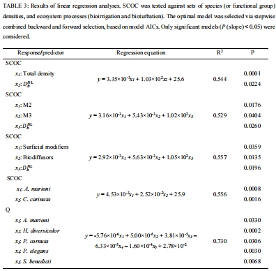 研究意義:表3中的回歸模型具有極高價值。模型顯示,總動物密度和生物擴散系數(D<sub>b</sub><sup>NL</sup>)共同解釋了SCOC變異的54.4%。當使用功能群密度時,表層修飾者和生物擴散者的密度與D<sub>b</sub><sup>NL</sup>一起,能解釋55.7%的變異。這定量地證明了特定功能群(表層生活、具有生物擾動能力的動物)的密度和它們的活動速率是控制SCOC的關鍵。這比單純使用分類學多樣性指標更具解釋力。