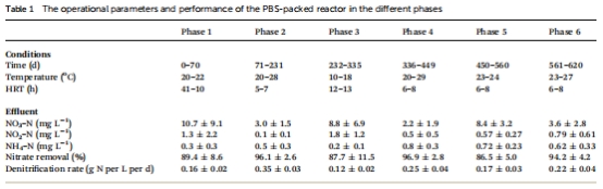 研究意義:這些核心數據直接證明了PBS固相反硝化系統的長期有效性。圖2和表1清晰顯示,在大部分運行時間(尤其在適宜溫度下),系統能保持高達95%以上的硝酸鹽去除率。數據還揭示了溫度是關鍵控制因素,低溫(10-18°C)下反硝化速率顯著降低(約降低65%),并伴有亞硝酸鹽積累,這為實際工程應用中的參數調控提供了重要依據。
