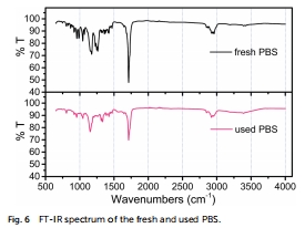 測量指標:PBS顆粒的重量隨時間的損失(圖4)、SEM圖像(圖5a, b)、FT-IR光譜(圖6)。