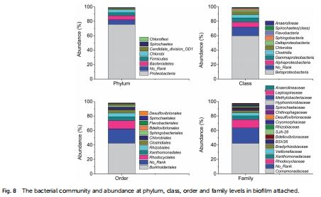 微生物群落分析:在運行約500天后,采集生物膜樣品,通過高通量測序(454焦磷酸測序)分析微生物群落在門、綱、目、科、屬水平的組成和相對豐度。