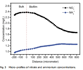 測量指標:使用Unisense微電極測得的生物膜內硝酸鹽(NO??)和銨鹽(NH??)的濃度垂直分布剖面(圖3),并據此計算的硝酸鹽消耗速率和銨鹽產生速率。