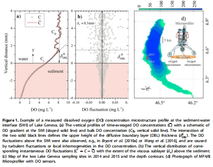 同步現場觀測:在萊蒙湖北部深水區(100-130米)的兩個站點,使用丹麥Unisense MP4/8微剖面儀以100微米的高分辨率測量SWI處的溶解氧垂直微剖面。同時,使用聲學多普勒流速剖面儀(ADCP)測量SWI上方0.25至2.0米水層的三維流速,從而精確計算摩擦速度(u*)等湍流參數。
