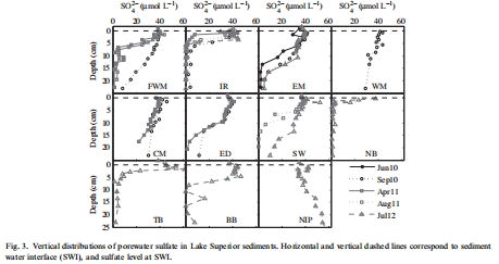 測量指標:蘇必利爾湖多個站點沉積物孔隙水中硫酸鹽(SO?2?)濃度隨深度的變化。