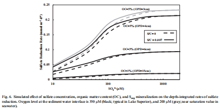 有機硫是低硫酸鹽環境中硫酸鹽還原的主要驅動力:在硫酸鹽濃度低于500 μM的環境中,沉積物中有機硫的礦化可以貢獻超過50%的硫酸鹽還原所需底物。在蘇必利爾湖(~40 μM),沉積物甚至是硫酸鹽的凈來源,硫酸鹽還原幾乎完全由內部產生的硫酸鹽支持。