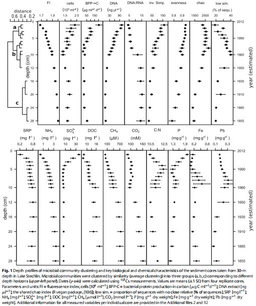 樣本采集:在德國Stechlin湖30米水深處采集了四個重復的沉積物巖心(每個30厘米長,代表了約170年的沉積歷史)。將每個巖心按1-4厘米的厚度分層。