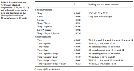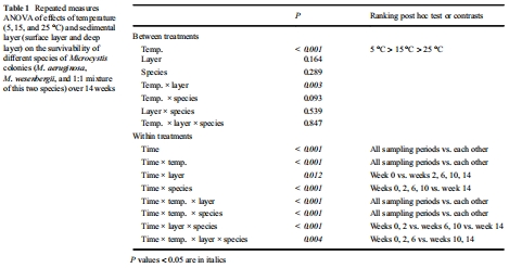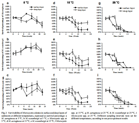 研究意義:這是最直接量化微囊藻在沉積物中存活能力的核心指標。圖2清晰地展示了溫度、沉積層深度和藻種對存活率的巨大影響。數據顯示,低溫(5°C)和深層厭氧環境能極有效地維持微囊藻群體的存活,而高溫(25°C)和表層好氧環境則導致群體迅速消亡。這些數據首次在受控條件下系統揭示了溫度是決定底棲微囊藻存活期限的首要關鍵因子,并證實了厭氧環境的保護作用。