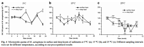 測量指標:總微囊藻毒素(MC)含量(沉積物中所有微囊藻細胞所含毒素總量)和毒素配額(平均每個細胞的毒素含量)。