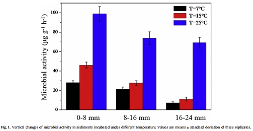 數據來源:圖1(caption: "Vertical changes of microbial activity in sediments incubated under different temperature")。