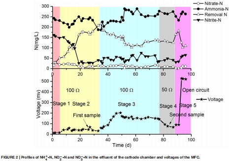 研究意義:這些數據直接表征MFC的產電穩定性與效率。例如,階段3(高DO)電壓升至100 mV,表明電極反硝化提升輸出;階段4(外阻50Ω)電壓進一步增加,證明低外阻促進電子傳遞,強化電極反硝化。