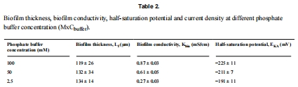 數據來源:表2(caption: "Biofilm thickness, biofilm conductivity, half-saturation potential and current density...")。