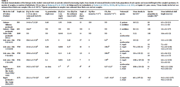 棲息地化學數據:測量了每個蛤蜊聚集區水體中的氧氣濃度(來自CALMAR采樣器)、沉積物中的氧氣滲透深度以及硫化物的濃度和峰值深度(來自沉積物巖心)。這些數據來自文檔中的表3。