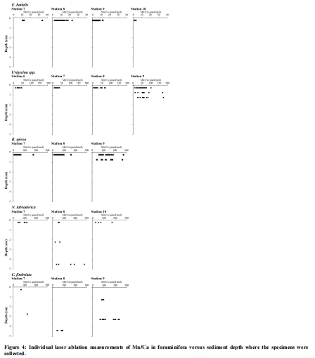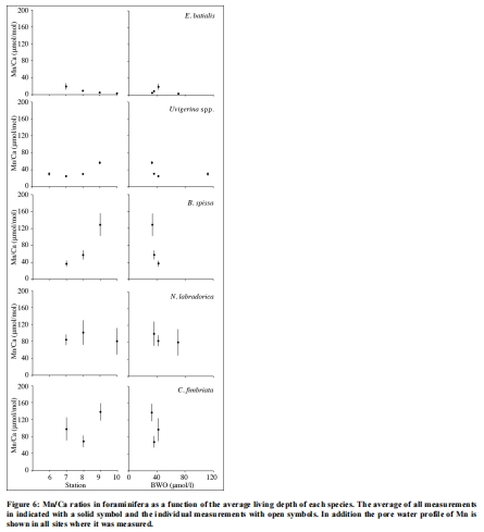 Mn/Ca比值確鑿地反映了微棲息地:在所有站點,淺底棲種 E. batialis的Mn/Ca比值最低,中間底棲種 Uvigerinaspp. 和 B. spissa次之,深底棲種 N. labradorica和 C. fimbriata最高。這證明有孔蟲殼體Mn/Ca是其棲息深度的可靠指標。