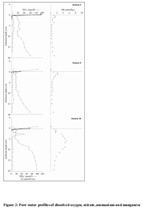 數據來源:文檔圖2清晰地展示了各站點的孔隙水化學剖面(氧、硝酸鹽、銨、錳)。