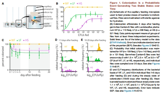 這篇發表在《Current Biology》上的論文核心觀點是:腸道微生物的定植是一個概率性事件,其穩定性源于一種“抽獎”機制。研究以果蠅及其天然共生菌(如植物乳桿菌)為模型,發現即使給予極高的細菌劑量,也只有一部分果蠅能被成功定植,而另一部分則保持無菌狀態,這表明腸道微生物組存在交替的穩定狀態(定植 vs. 未定植)。這種差異是由隨機因素和種群瓶頸效應驅動的。研究還發現,腸道內不同的空間棲息地調節著最大定植機會,而已定植的菌種會通過競爭降低后續菌種的定植幾率,從而促進整個微生物組結構的穩定性。這項研究為理解個體間微生物組差異的起源以及如何精確調控微生物組(如益生菌植入)提供了新的理論框架。