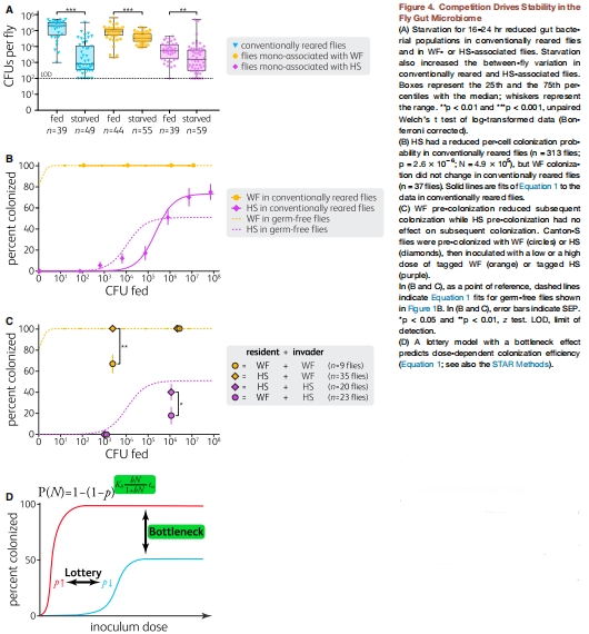 多時間點動態監測:在灌喂細菌后的不同時間點(最長達20天),檢測單個果蠅的腸道細菌載量、定植比例,并計算細菌的生長、死亡和脫落速率。