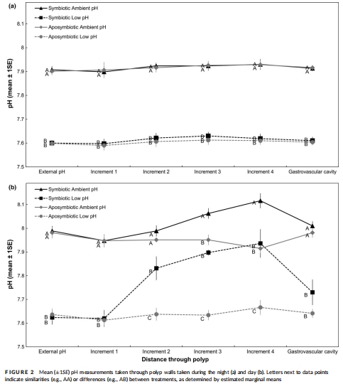 內部化學環境得到改善:微電極測量證實,在白天,共生型息肉內部的pH值顯著高于外界環境和非共生型息肉,這直接證明了蟲黃藻通過吸收CO2來幫助宿主抵抗外部酸化,穩定其內部化學環境。