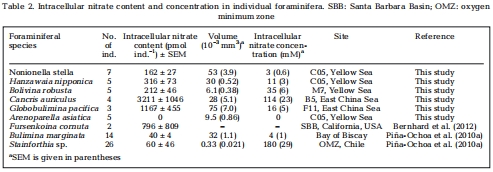 數據來源:五種有孔蟲的細胞內硝酸鹽含量詳細列在 文檔表2中。