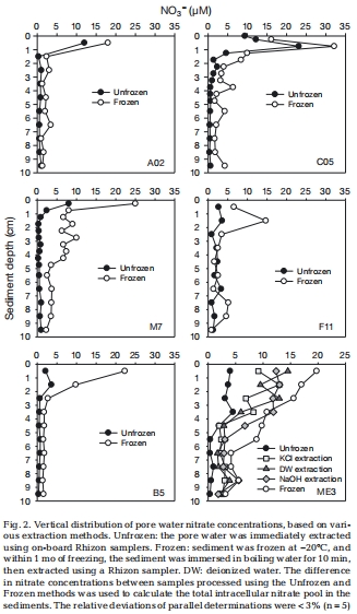 沉積物細胞內硝酸鹽庫:使用多種萃取方法(如冷凍法)來測量整個沉積物中所有生物(包括有孔蟲、硅藻等)的細胞內硝酸鹽總量。