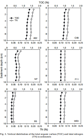 沉積物化學性質:測量了孔隙水硝酸鹽剖面、總有機碳、總氮、葉綠素a等。