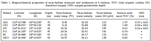 環境參數測量:同步測量了近底層海水的溫度、鹽度、溶解氧,以及沉積物的孔隙水硝酸鹽、總有機碳、總氮、葉綠素a等植物色素指標,以表征環境條件。