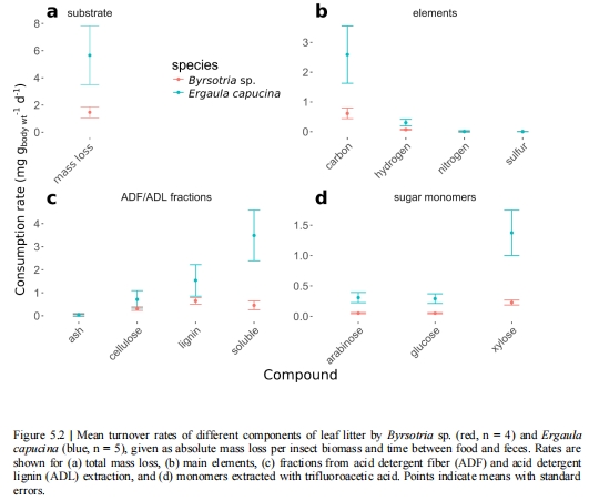 測量指標:通過質量平衡計算食物和糞便中纖維素、半纖維素、木質素的含量變化,并利用HPLC量化碳水化合物單體(如葡萄糖、木糖)。Figure 5.2顯示木糖(半纖維素標志)的周轉率顯著高于葡萄糖(纖維素標志)。