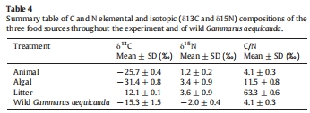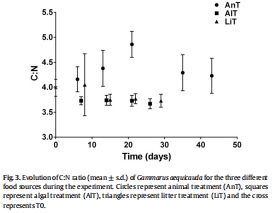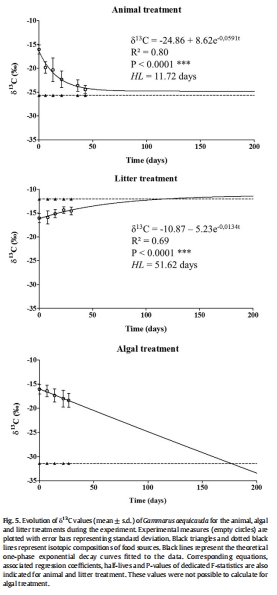 數據來源:δ13C隨時間變化的曲線展示在 文檔圖5中;δ15N的數據展示在 文檔圖6中;C:N比的變化展示在 文檔圖3中。食物和端足類的初始同位素與元素組成總結在 文檔表4中。