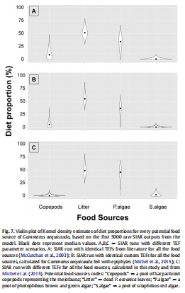 貝葉斯混合模型(SIAR)結果:使用不同TEF參數運行模型得到的食源貢獻比例。