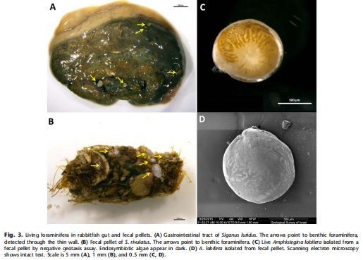 研究意義:這是證明“魚類傳播”直接證據的核心。發現在每顆糞便中存在2-80個空殼和1-50個活體有孔蟲,共計29種,其中11種是已知的入侵種。活體有孔蟲外殼完整且共生藻存活,證明它們能成功通過兔子魚的消化道并保持活力,具備了在新環境中定殖的潛力。