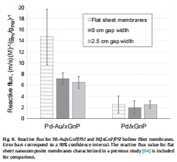 研究意義:這是評估膜催化性能的核心量化指標(biāo)。數(shù)據(jù)清晰表明,Pd-Au/xGnP/PSf膜的反應(yīng)通量顯著高于Pd/xGnP/PSf膜(文檔圖8),直接證明了雙金屬催化劑在膜反應(yīng)器構(gòu)型下的優(yōu)越性。此外,空氣間隙對反應(yīng)通量無顯著影響,說明催化活性主要取決于催化劑本身而非膜形態(tài)的微小差異。