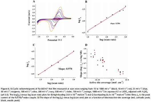 研究意義:揭示MOF薄膜內的電荷傳輸方式,并間接反映活性位點的分布。數據顯示,log(ip)與log(v)關系圖的斜率隨催化劑負載量的增加而從1向0.5轉變(文檔圖6B-D)。這表明在低負載下,電化學反應由表面控制(b≈1);在高負載下,轉變為由薄膜內部的電子擴散(跳躍)控制(b≈0.5)。這證明電活性位點并非僅存在于薄膜表面,而是遍布整個MOF體相,對于實現高催化劑利用率至關重要。