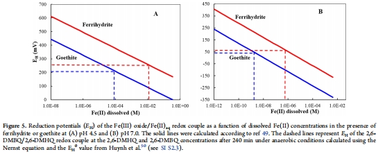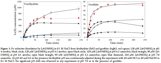 數據內容:有氧條件下Fe(II)產率遠低于理論值(2 Fe(II) : 1 H?Q);厭氧條件下Fe(II)濃度升高(如pH 4.5時,水鐵礦釋放約70 μM Fe(II),針鐵礦約30 μM)。