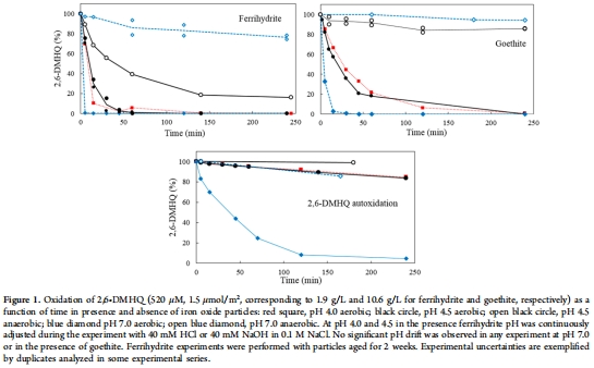 在可控pH(4.0、4.5、7.0)和氧氣條件(有氧:270–310 μM O?;厭氧:0–20 μM O?)下進行批次實驗,監測2,6-DMHQ氧化和Fe(II)釋放(圖1、圖3)。