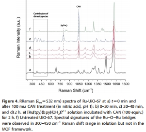研究意義:從分子層面追蹤催化劑的化學狀態。RRaman譜圖(文檔圖3, 4)顯示,在CAN氧化后,MOF中釕催化劑的譜圖發生變化,對應于從Ru(II)-OH?到Ru(V)=O活性物種的轉變。更重要的是,在均相催化劑溶液中觀察到的二聚體特征峰,在MOF樣品中完全消失(文檔圖4)。這為“MOF固定化能有效阻止催化劑二聚化失活”提供了直接的譜學證據。