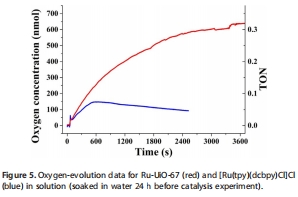 研究意義:直接比較MOF催化劑與均相催化劑的性能優劣。氧氣生成曲線(文檔圖5)清晰顯示,Ru-UiO-67不僅初始產氧速率更高,而且催化壽命遠長于均相催化劑。均相催化劑在10分鐘后即失活,而MOF催化劑能持續產氧超過50分鐘。這強有力地證明了MOF骨架在穩定催化劑、延長其壽命方面的巨大優勢。