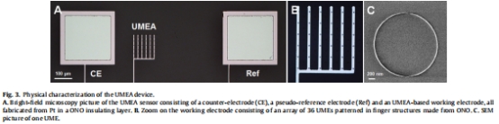 數(shù)據(jù)來源:UMEA傳感器的整體結(jié)構(gòu)和單個微電極的SEM圖像展示在 文檔圖3中。AFM和SEM測量的具體尺寸數(shù)據(jù)在論文正文的“4.2. Physical characterization of the UMEA”部分給出。