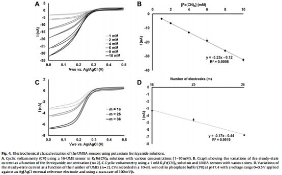 研究意義:用于驗證UMEA傳感器的基本電化學(xué)功能是否正常,并確認(rèn)其具有微電極的典型特征(呈S形的穩(wěn)態(tài)伏安曲線)。穩(wěn)態(tài)電流與鐵氰化鉀濃度(文檔圖4A, B)以及傳感器中微電極數(shù)量(文檔圖4C, D)的線性關(guān)系,強有力地證明了傳感器按設(shè)計工作,每個微電極獨立貢獻,且制備成功率高。實驗值與理論值的良好吻合(誤差<10%)進一步證實了這一點。
