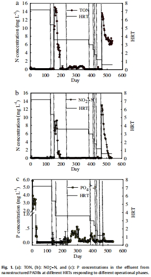 數據主要來自圖1(a)和(b),顯示了不同HRT下 effluent 中的總氧化氮(TON)和亞硝酸鹽氮(NO2-N)濃度。