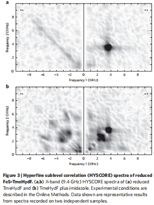 數據內容:加入咪唑后,在(5.5, 2.4) MHz處出現雙量子特征峰,表明咪唑取代了Glu305與簇結合。