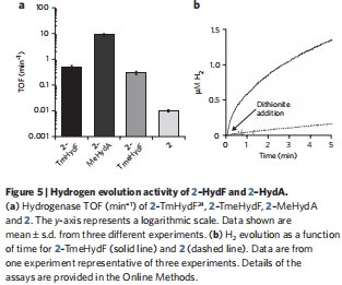 數據內容:2-TmeHydF的產氫轉換頻率(TOF)為0.3 min?1,比游離化合物2高30倍,但比成熟氫酶(2-HydA)低20–30倍。