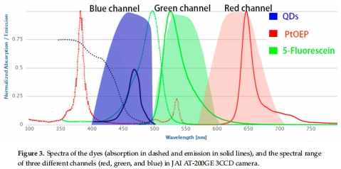 數(shù)據(jù)內(nèi)容:PtOEP、5-Fluorescein和QDs的發(fā)射峰分別位于650 nm(紅)、520 nm(綠)和460 nm(藍),光譜重疊可忽略。
