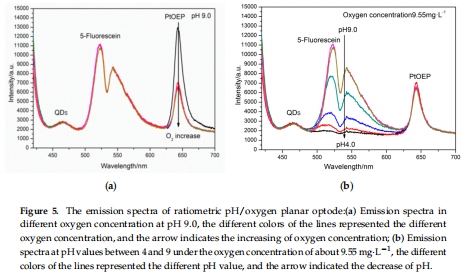 選擇PtOEP(發(fā)射紅光)作為氧指示劑,5-Fluorescein(發(fā)射綠光)作為pH指示劑。