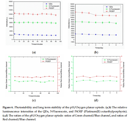 數(shù)據(jù)內(nèi)容:連續(xù)光照100分鐘后,各染料發(fā)光強度下降<10%(QDs:9.82%, 5-Fluorescein:4.70%, PtOEP:6.45%);浸泡一周后強度下降<14%,比率變化<8.5%。