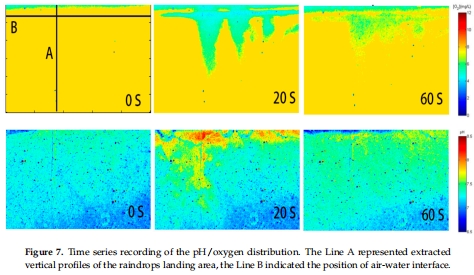 數(shù)據(jù)內(nèi)容:模擬降雨40秒內(nèi),海水表層(深0-23 mm)氧濃度上升2.3 mg/L,pH降至7.2;垂直和水平剖面顯示降雨對近界面化學(xué)梯度的顯著影響。