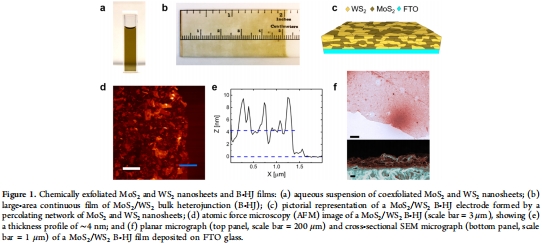 采用液-液界面自組裝和 dip-coating 法在FTO玻璃上制備均勻薄膜(厚度4–60 nm),包括單獨MoS?、WS?及MoS?/WS?異質(zhì)結(jié)(B-HJ)(圖1b–f)。