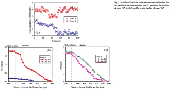 關鍵數據:生物膜表層DO接近bulk solution(A區0.2-1.8 mg/L,B區2.5-3.0 mg/L),深層(>250μm)降至<0.1 mg/L,形成厭氧區。