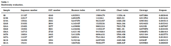 數據內容:Shannon指數在A區從5.65(S19A)升至6.42(S36A)后降至4.87(S61A);B區從6.09(S19B)升至6.25(S36B)后降至5.19(S61B)。ACE和Chao1指數顯示類似先增后降趨勢。