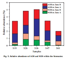 數據內容:AOB(氨氧化菌)和NOB(亞硝酸鹽氧化菌)在30天時豐度最高(A區AOB 1.58%,NOB 0.36%),47天后下降;B區AOB豐度始終高于A區。